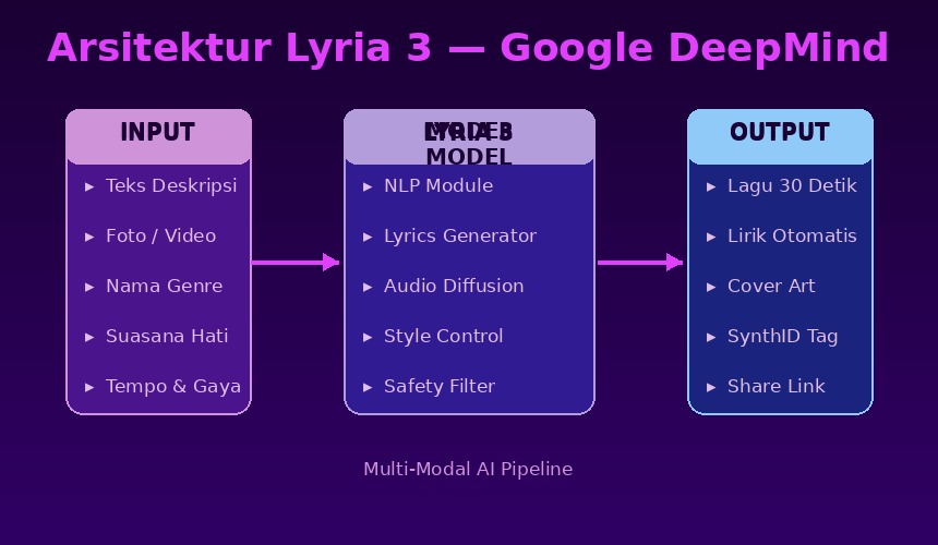 Gambar 2: Diagram arsitektur Lyria 3 — pipeline multi-modal dari input teks/visual hingga output audio