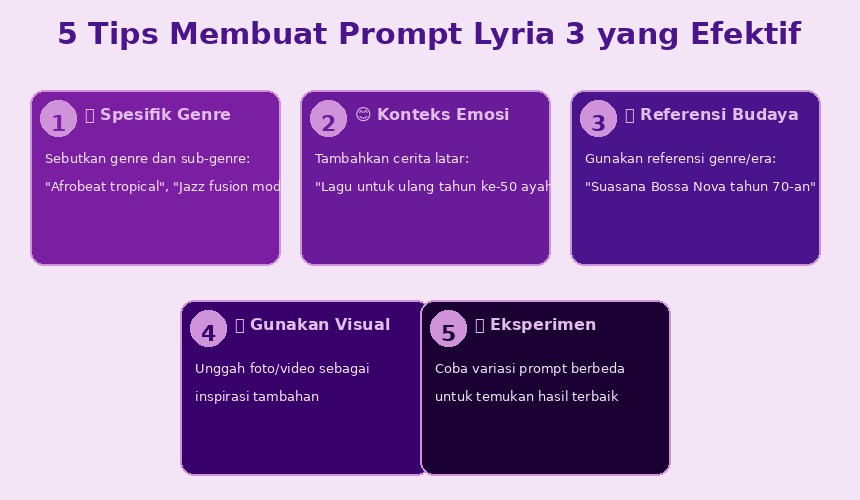 Gambar 7: Lima tips utama untuk membuat prompt Lyria 3 yang menghasilkan musik berkualitas tinggi