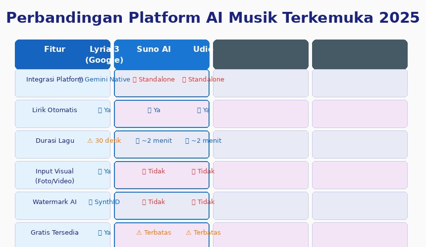 Gambar 5: Perbandingan fitur utama antara Lyria 3 (Google), Suno AI, dan Udio — platform AI musik terkemuka 2025