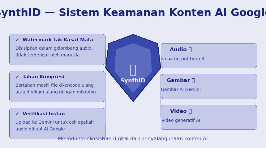 Di era di mana deepfake dan konten AI semakin sulit dibedakan dari konten asli, Google mengambil langkah proaktif dengan mengintegrasikan SynthID ke semua output Lyria 3. SynthID adalah sistem watermarking yang dikembangkan Google DeepMind untuk memberikan "tanda tangan digital" yang tidak terlihat pada konten yang dihasilkan AI.
