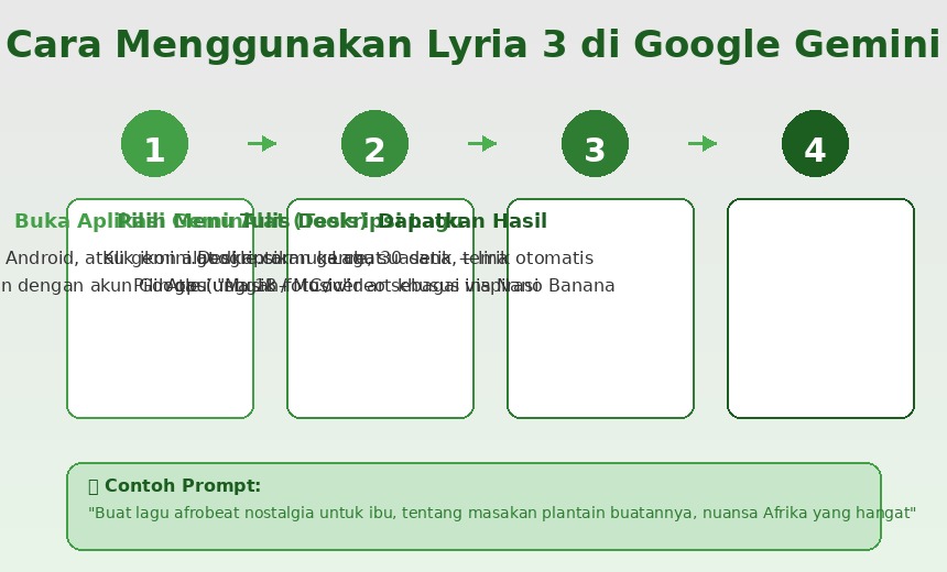 Gambar 3: Panduan langkah demi langkah menggunakan fitur generasi musik Lyria 3 di Google Gemini