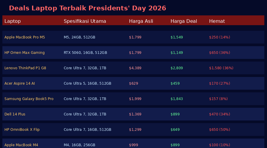 Tabel lengkap deals laptop Presidents' Day 2026 — spesifikasi, harga asli, harga deal, dan penghematan