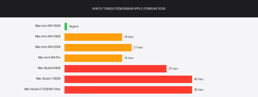 Data waktu tunggu pengiriman Apple Store AS, Februari 2026. Pola yang jelas terlihat: semakin tinggi kapasitas RAM, semakin panjang antrean pengiriman.