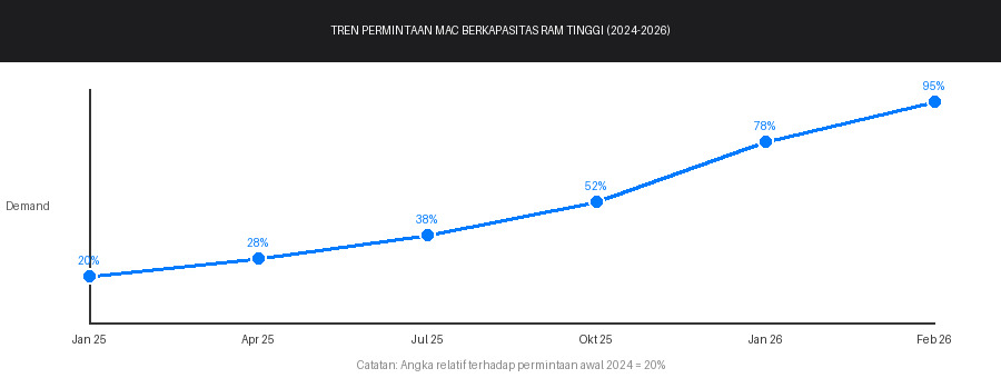 Tren permintaan Mac berkapasitas RAM tinggi yang meningkat drastis sejak 2024, dengan akselerasi tajam di awal 2026 seiring meledaknya popularitas OpenClaw dan AI agent serupa.