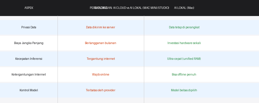 Perbandingan komprehensif antara penggunaan AI berbasis cloud versus AI lokal menggunakan Mac mini atau Mac Studio — masing-masing memiliki kelebihan dan kekurangan yang perlu dipertimbangkan sesuai kebutuhan.