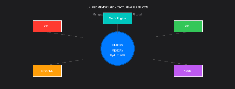 Untuk memahami mengapa Mac mini dan Mac Studio menjadi pilihan favorit untuk menjalankan AI lokal, kita perlu memahami sebuah konsep arsitektur yang membedakan chip Apple Silicon dari chip Intel atau AMD konvensional: Unified Memory Architecture atau UMA.