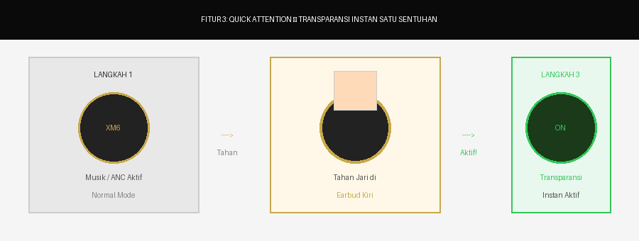 Tiga langkah menggunakan Quick Attention Sony WF-1000XM6: dari mode musik normal, cukup tahan jari pada earbud kiri selama satu detik, dan mode transparansi instan aktif tanpa perlu melepas earbuds atau mencari tombol.