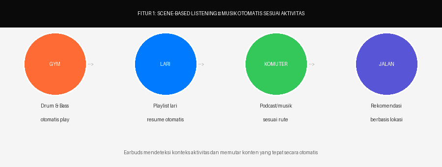 Scene-Based Listening: otomatis menyesuaikan musik sesuai aktivitas (gym, lari, jalan, komuter).