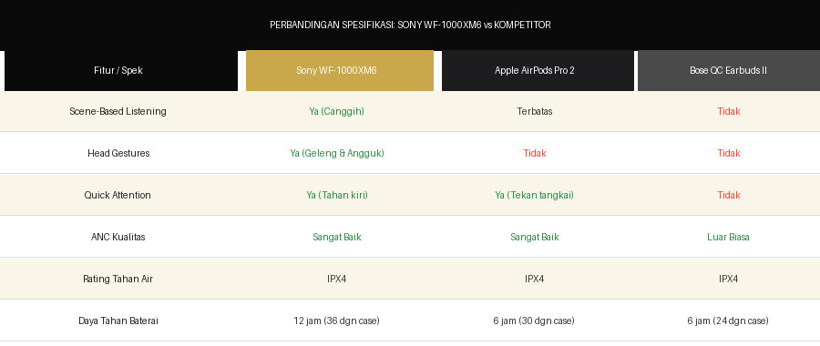 Perbandingan head-to-head antara WF-1000XM6 dengan kompetitor utamanya memberikan gambaran yang menarik tentang positioning produk ini di pasar. Sony secara jelas mengungguli kompetitor dalam hal kedalaman dan inovasi fitur: Scene-Based Listening dan Head Gestures adalah fitur yang tidak dimiliki oleh Apple AirPods Pro 2 maupun Bose QuietComfort Earbuds II dalam bentuk yang sebanding.