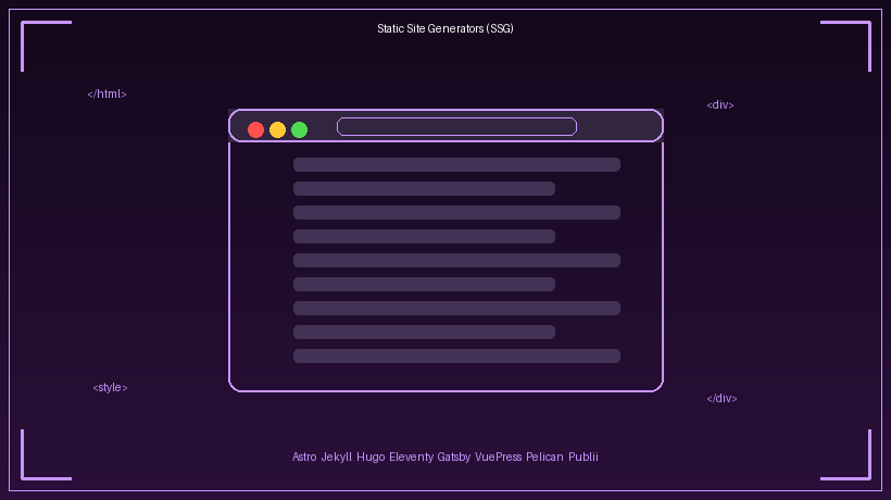 SSG adalah tools yang menghasilkan website statis secara otomatis dari konten (Markdown/JSON/YAML) dan template. Contoh populer: Astro, Hugo, Jekyll, Eleventy, Gatsby.